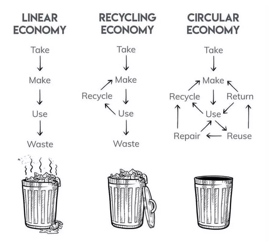 In a linear economy products are produced and go directly to waste after they are used. This not ideal for the environment as it wastes resources and does not reuse what already is produced. In a recycling economy products are recycled after their use but then thrown out eventually. This is not better, because waste is minimized, however waste is still generated. Finally, the circular economy allows products to be reused more than once and ideally forever. In a circular economy little or no waste is generated because everything is reused, recycled or repaired.